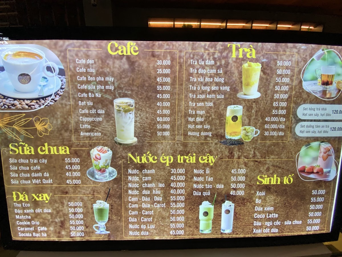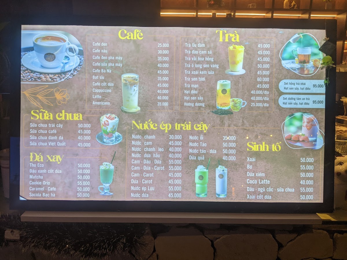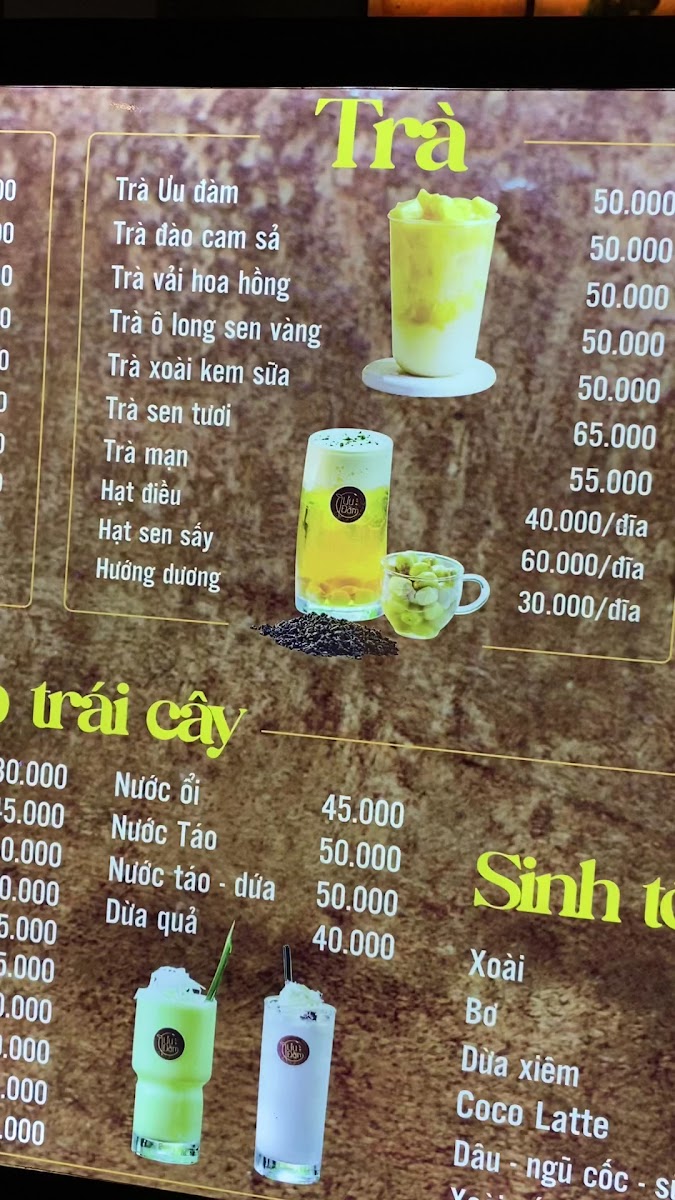 The menu at Ưu Đàm Trà Hoa primarily features a selection of coffee and tea beverages suited for casual visits and coffee breaks. Visitors can find a variety of brewed coffee options alongside several healthy tea choices. The menu also includes specialty items such as Sữa Chua Hoa Quả (fruit yogurt) and Thu Eco, which complement the drink offerings.